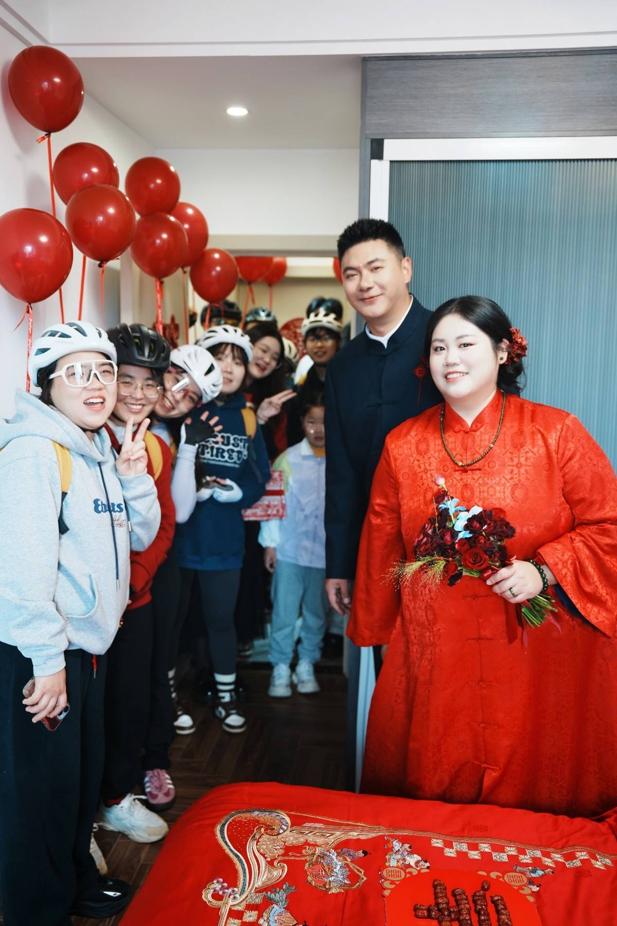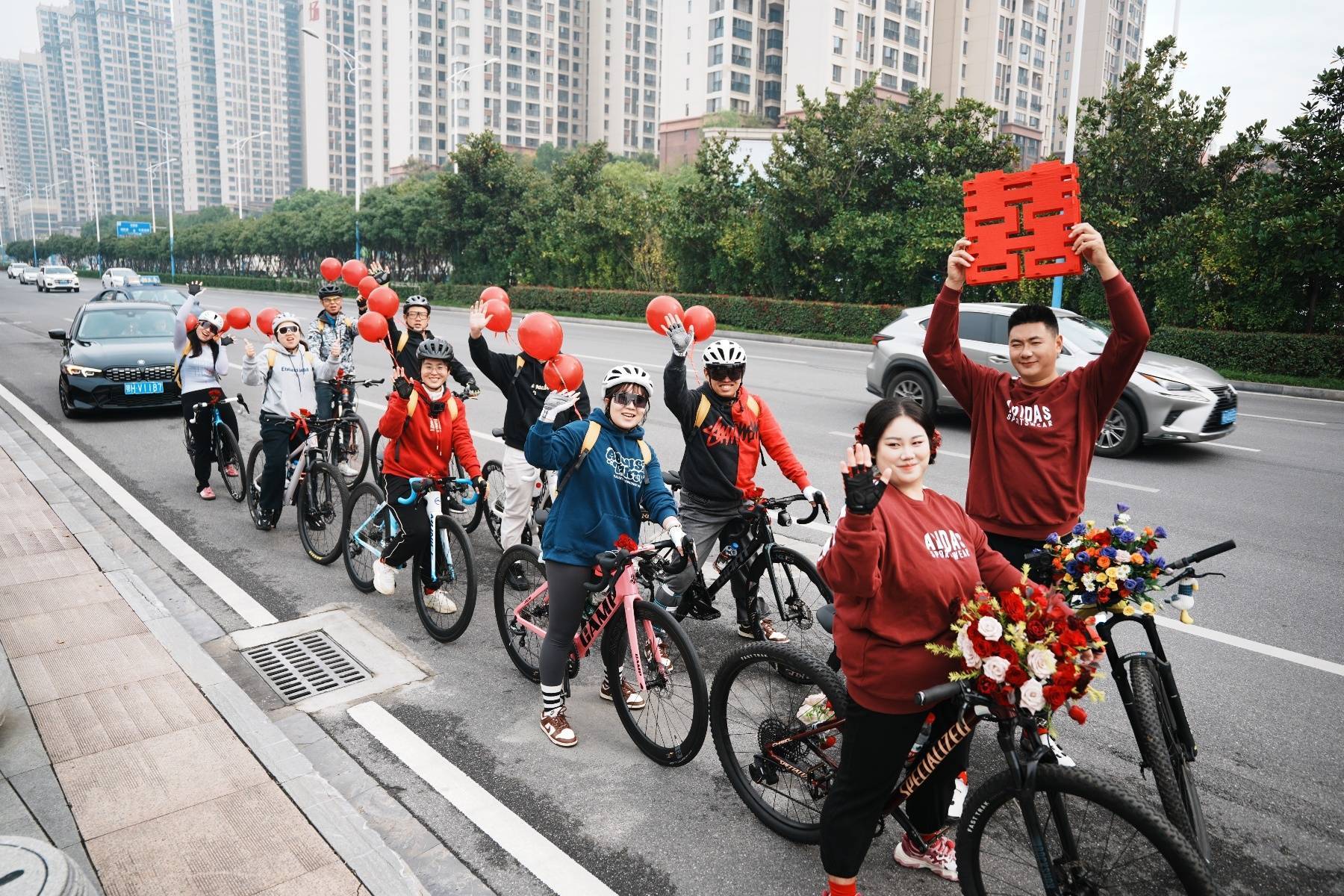 婚礼于11月1日举行,接亲队伍由两人熟识的骑友组成,大家身着运动服,骑着各自的山地车。统一的背包上系着的红气球随风轻扬。新郎新娘在队伍最前方领骑,其“主婚车”装点着鲜艳扎花,整支队伍在街道上格外醒目。