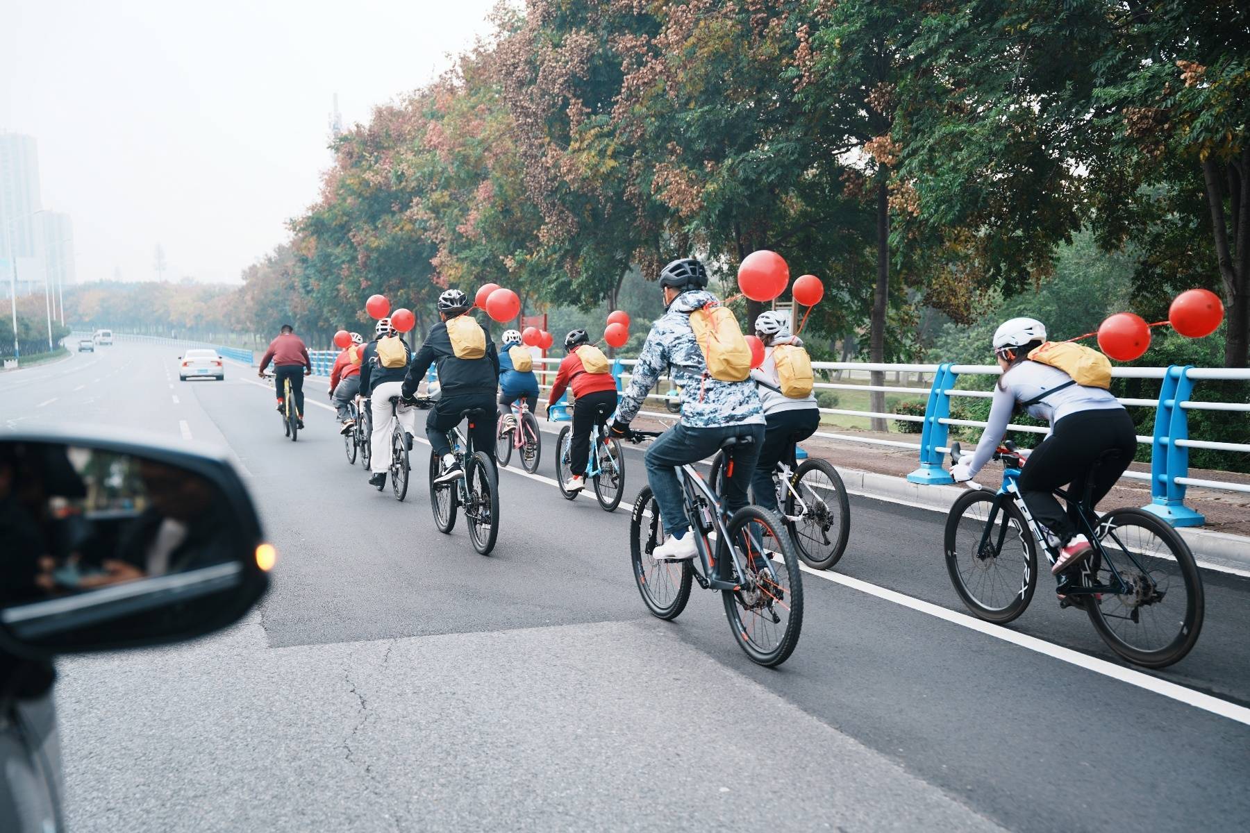 迎亲队伍骑着山地车,背上系着红气球的背包,一路上格外醒目。图/受访者提供